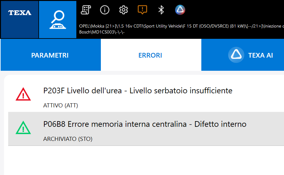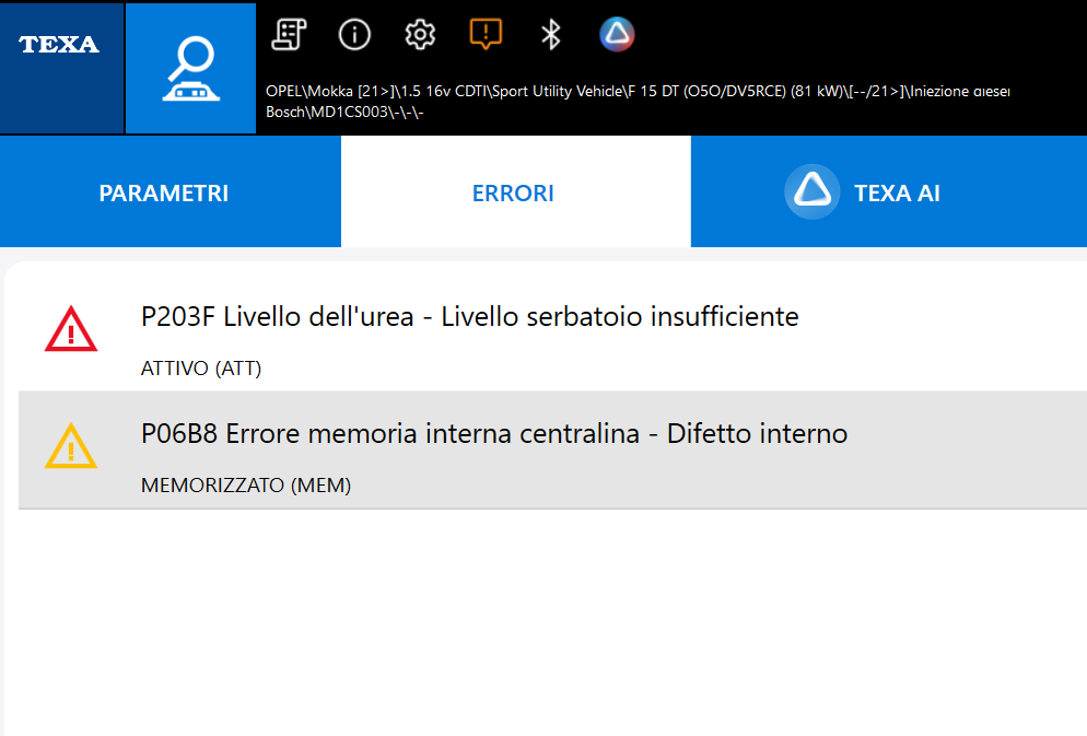 Il difetto lamentato è la comparsa di un errore interno in centralina che non può essere cancellato. Normalmente l’errore è accompagnato da altri guasti o difetti rilevati sul motore, come nel caso in esame. In questo specifico caso, oltre l’errore sulla memoria della centralina è presente un errore relativo al basso livello di AdBlue nel serbatoio.